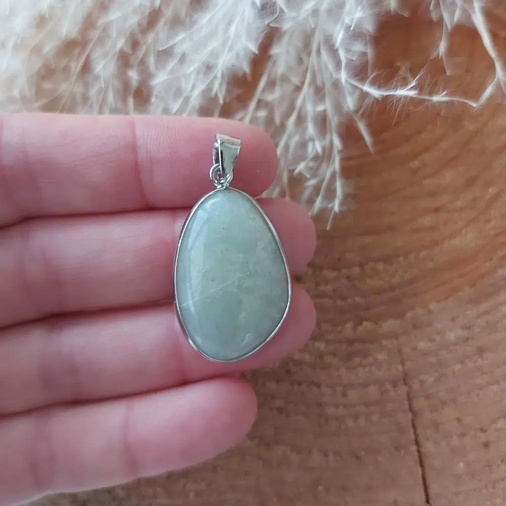 Dieser ovale grüne Amazonit Anhänger hat eine versilberte Fassung. Er wirkt sehr zart und doch kraftvoll, weil der Amazonit direkt auf deiner Haut aufliegt. Bei Bedarf kannst du eine passende Lederkette dazu kaufen.