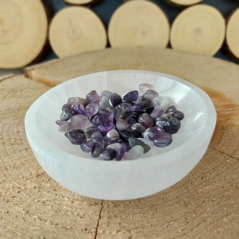 Amethyst in Form von Chips – das sind ganz kleine getrommelte Stücke von Amethysten. Diese Chips kannst du für Naturkosmetik verwenden oder auch in eine Schale zu anderen Heilsteinen legen.
