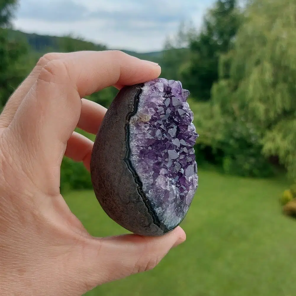 Enzückendes poliertes Amethyst Cluster Ei aus Brasilien. Durch diese Eiform liegt es besonders gut in der Hand. Hohe Qualität!