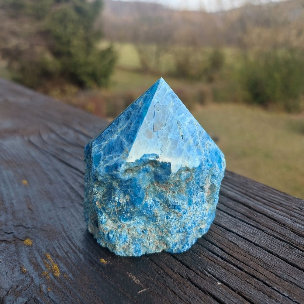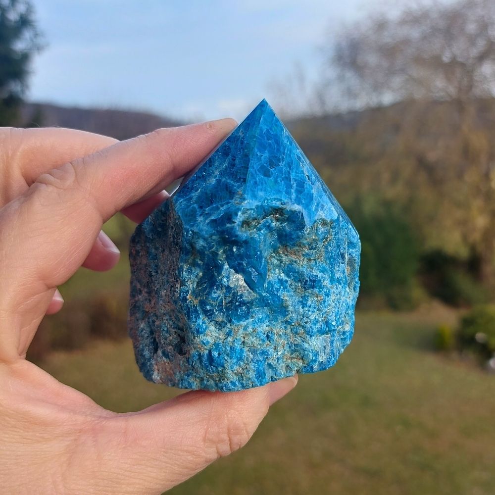 Diese kraftvolle Apatit Spitze ist halbpoliert. Dieser Apatit unterstützt dich dabei zu deiner Wahrheit zu kommen. Er hilft dabei, deine Träume zu verwirklichen, dich selbst zu entfalten und unterstützt dabei deine Motivation dein Ziel zu erreichen.