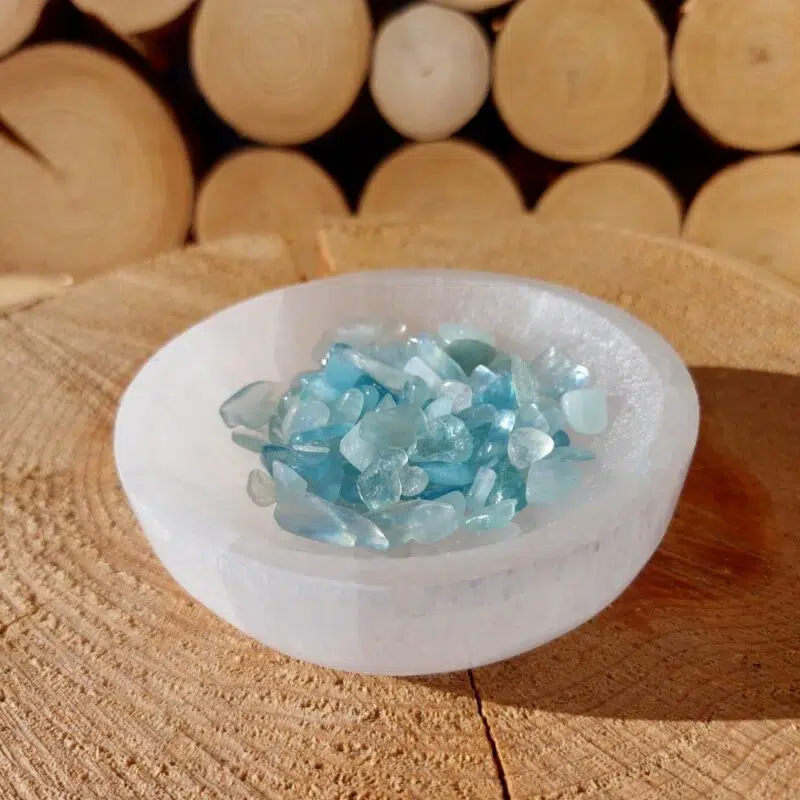 Aquamarin in Form von Chips – das sind ganz kleine getrommelte Stücke vom blauen Aquamarin. Diese Chips kannst du für Naturkosmetik verwenden oder auch in eine Schale zu anderen Heilsteinen legen.