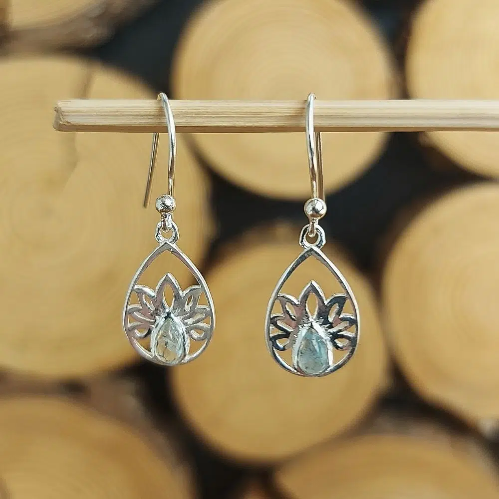 Zarte Aquamarin Ohrringe (aus echtem Silber) in Tropfenform und mit einer Lotus Blume.