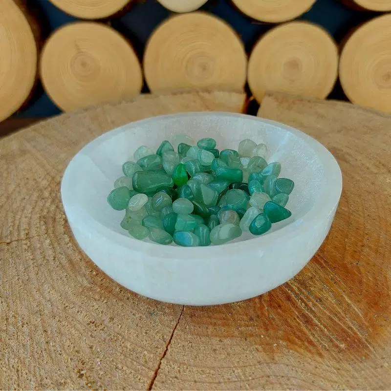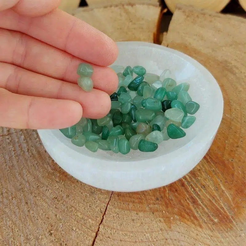 Grüner Aventurin in Form von Chips – das sind ganz kleine getrommelte Stücke von grünem Aventurin. Diese Chips kannst du für Naturkosmetik verwenden oder auch in eine Schale zu anderen Heilsteinen legen.