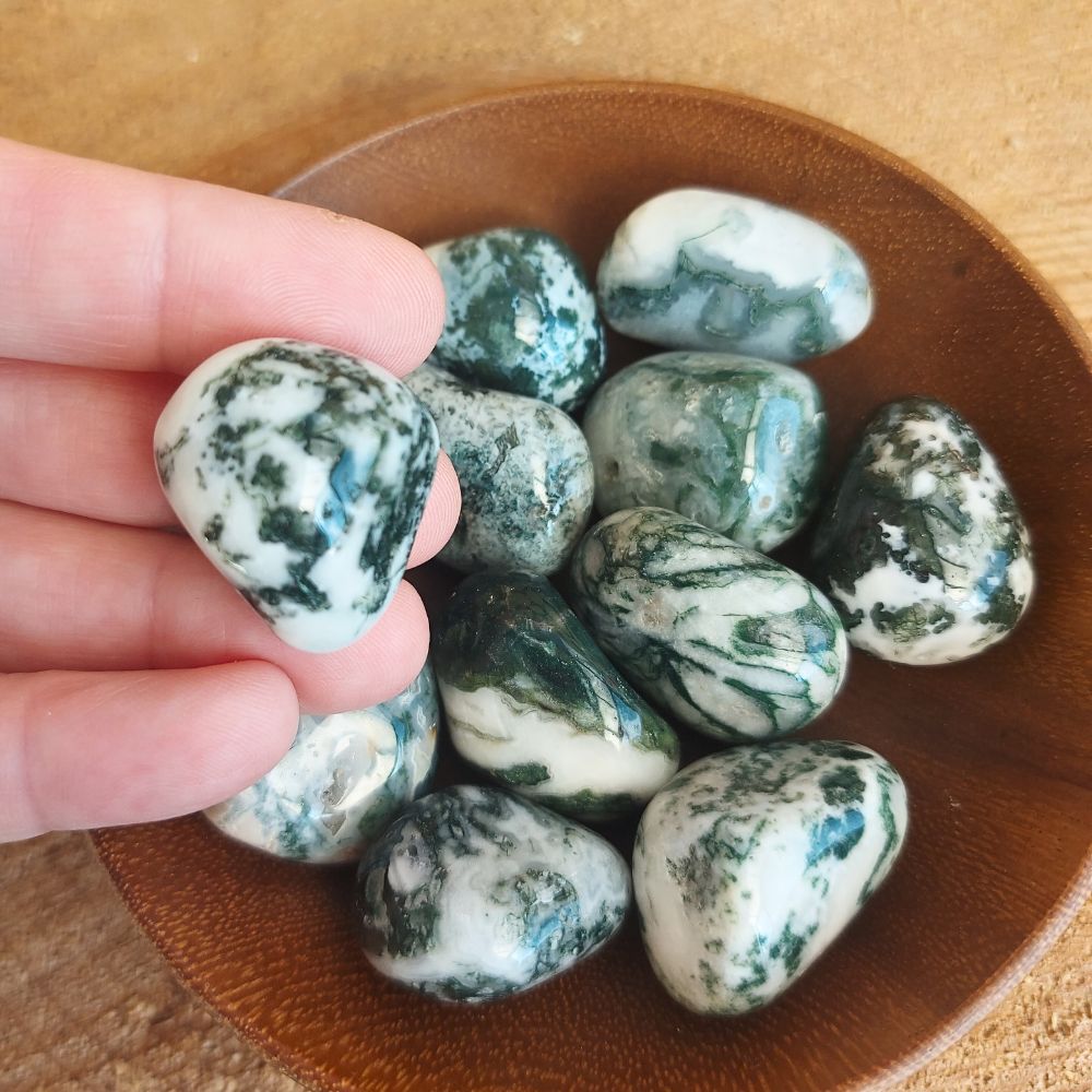 Baumachat, auch bekannt als dendritischer Achat, ist ein weißer Stein mit grünen Einschlüssen. Diese Einschlüsse werden als Dendriten bezeichnet. Er ist nach der Art benannt, wie diese Einschlüsse oft Baumzweigen ähneln.