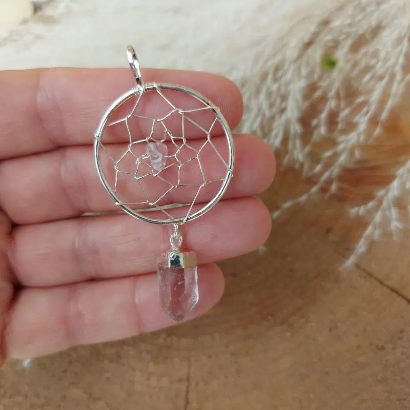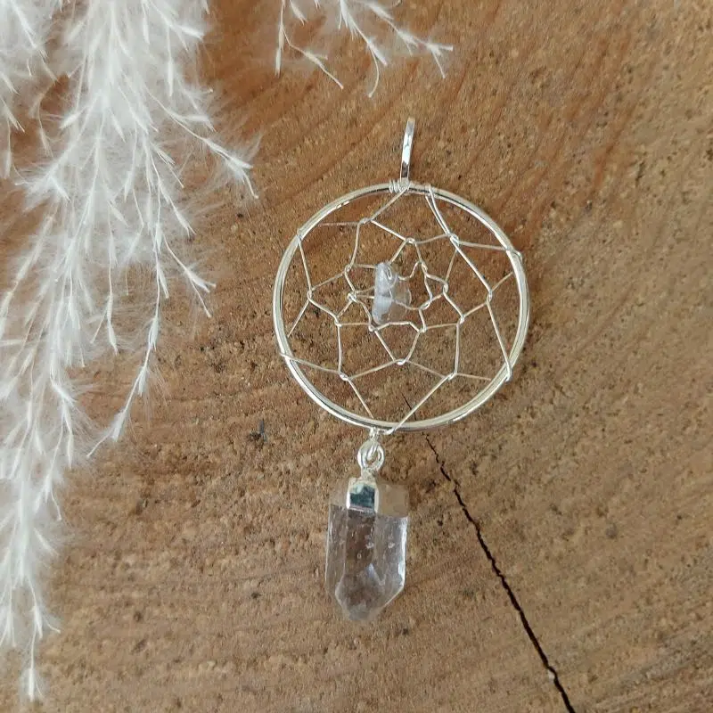 Bezaubernder Bergkristall Traumfänger Anhänger (versilbert) für deine Klarheit.