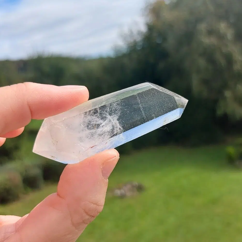 Doppelender haben an jedem Ende einen Spitze. Die zweite Spitze entsteht, wenn sich der Kristall früh in seinem Leben von seiner Basis löst oder wenn er in weicher Erde gebildet wird. Sie sind viel seltener als Eine-Spitzen-Kristalle und projizieren Energie von beiden Enden aus, wodurch ein gemeinsames Energiefeld entsteht.