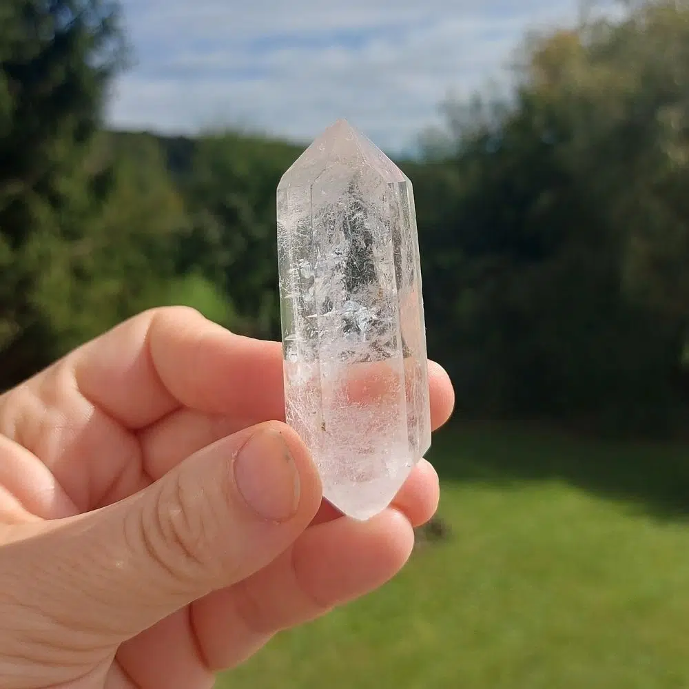 Doppelender haben an jedem Ende einen Spitze. Die zweite Spitze entsteht, wenn sich der Kristall früh in seinem Leben von seiner Basis löst oder wenn er in weicher Erde gebildet wird. Sie sind viel seltener als Eine-Spitzen-Kristalle und projizieren Energie von beiden Enden aus, wodurch ein gemeinsames Energiefeld entsteht.