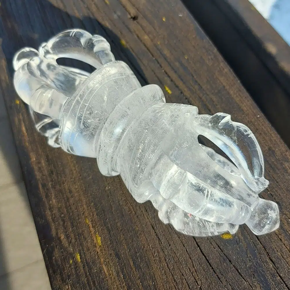 Ein Bergkristall-Dorje vereint diese tiefe symbolische Bedeutung mit der klaren, lichtvollen Energie des Bergkristalls. Der transparente Stein verstärkt Bewusstsein, Konzentration und energetische Reinigung. Er wirkt besonders kraftvoll bei Meditationen oder Heilritualen und hilft, alte Blockaden zu lösen. Ein Bergkristall-Dorje strahlt Reinheit, Klarheit und geistige Stärke aus – er dient als Lichtträger auf dem Weg zu innerer Erleuchtung.