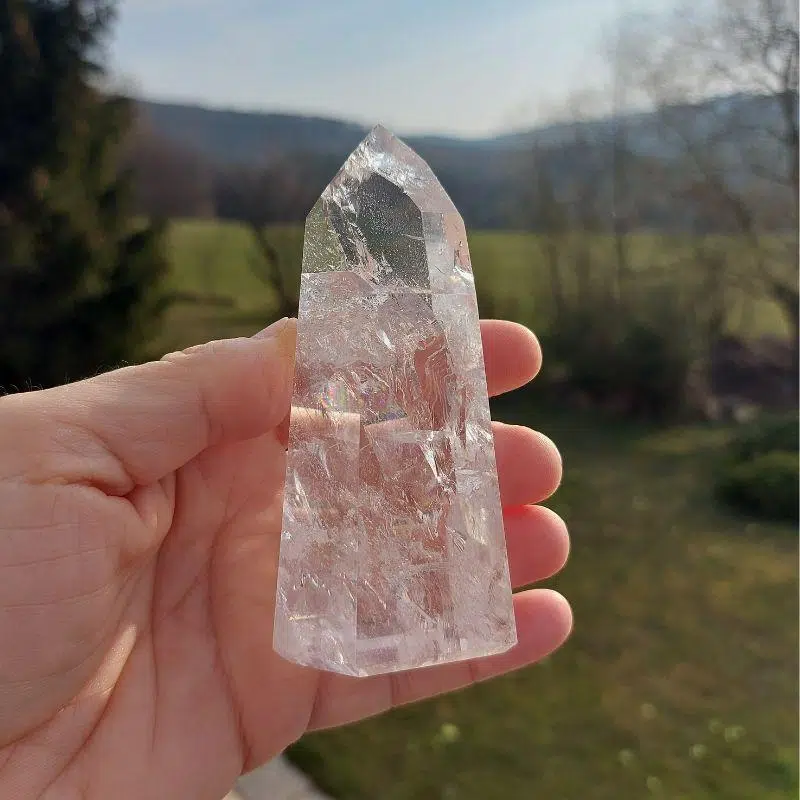 Feuer- und Eis Bergkristall (Regenbogenquarz) entsteht durch Erhitzung und anschließende rasche Abkühlung und besitzt die gegensätzlichen Energien von Feuer und Wasser, von hell und dunkel.