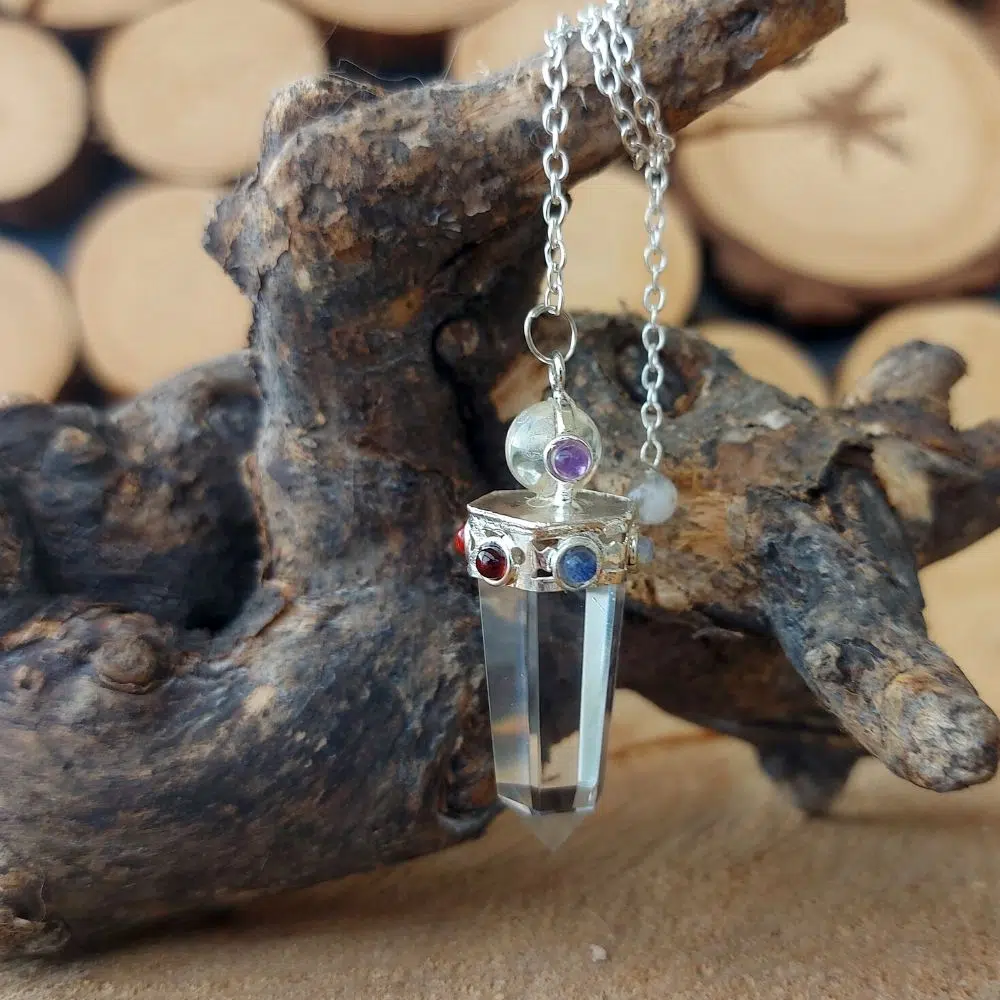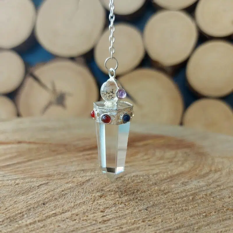 Einzigartiges Pendel mit einer Bergkristall Spitze und Chakra Heilsteinen verziert und einer Silberkette. Die zusätzlichen kleinen Heilsteine verstärken den Energiefluss des Pendels und deine Verbindung  zu ihm.