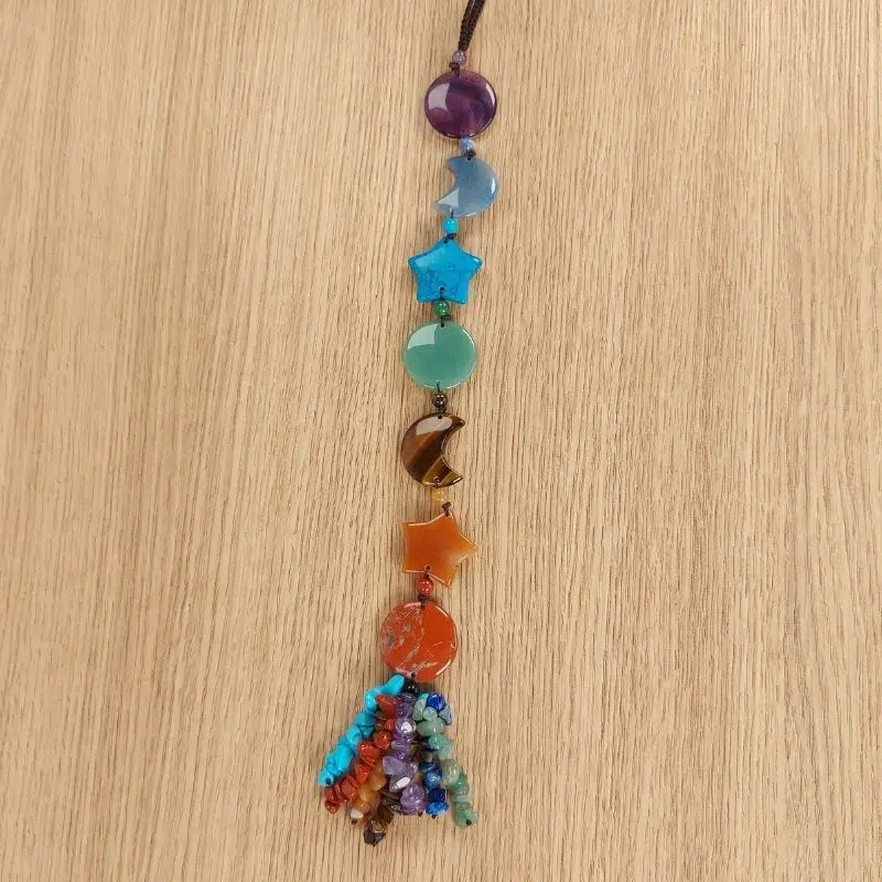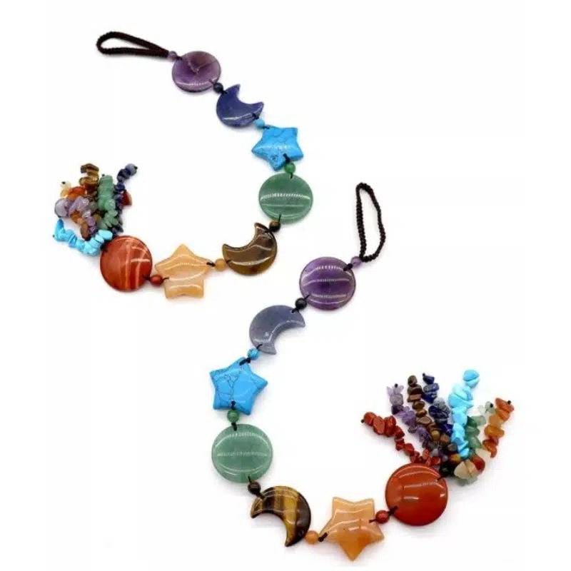 Dieses bewundernswerte Chakra Ornament besteht aus den 7 Chakra Heilsteinen in unterschiedlichen Formen (Kreis, Stern, Mond). Es enthält außerdem noch 7 kleine Stränge aus den 7 Chakra Heilsteinen.