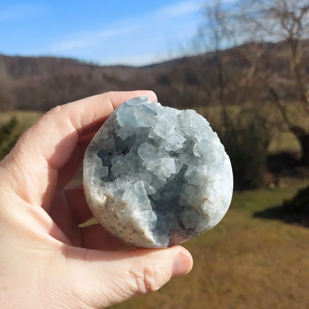Dieser zart blaue Coelestin Cluster liegt optimal wie eine Kugel in deiner Hand. Er weist dir den Weg zu deiner spirituellen Verbindung und einer tiefen meditativen Erfahrung.