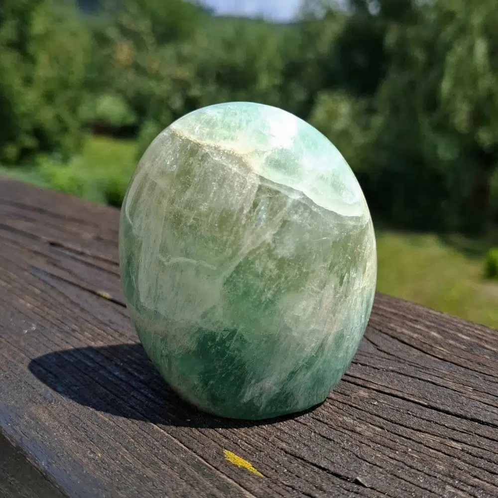 Dieser bezaubernde grüne polierter Fluorit in Freiform kommt aus Madgaskar. Die strahlenden Linien erinnern häufig an die Sonnenstrahlen – eine wunderschöne und komplexe innere Zeichnung!