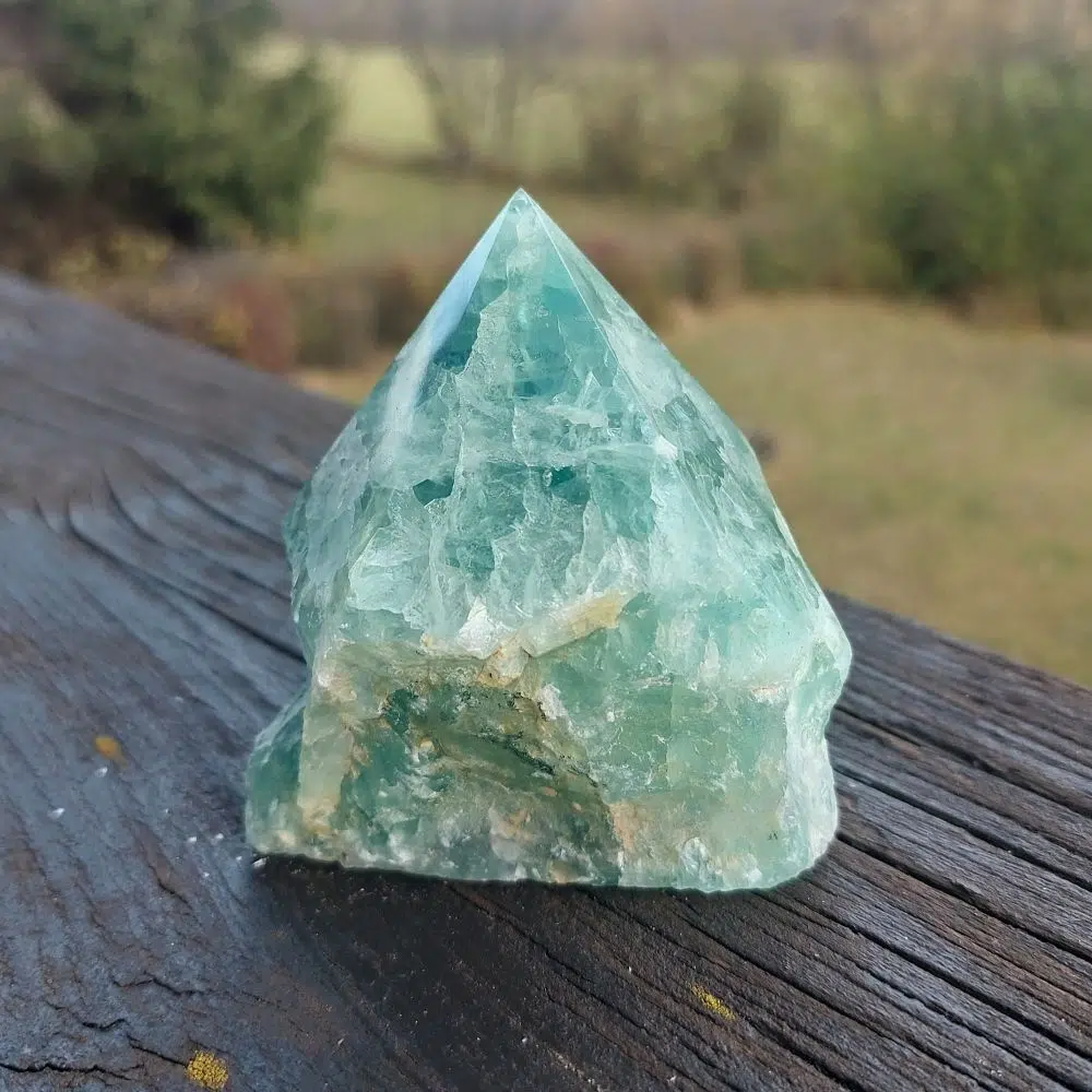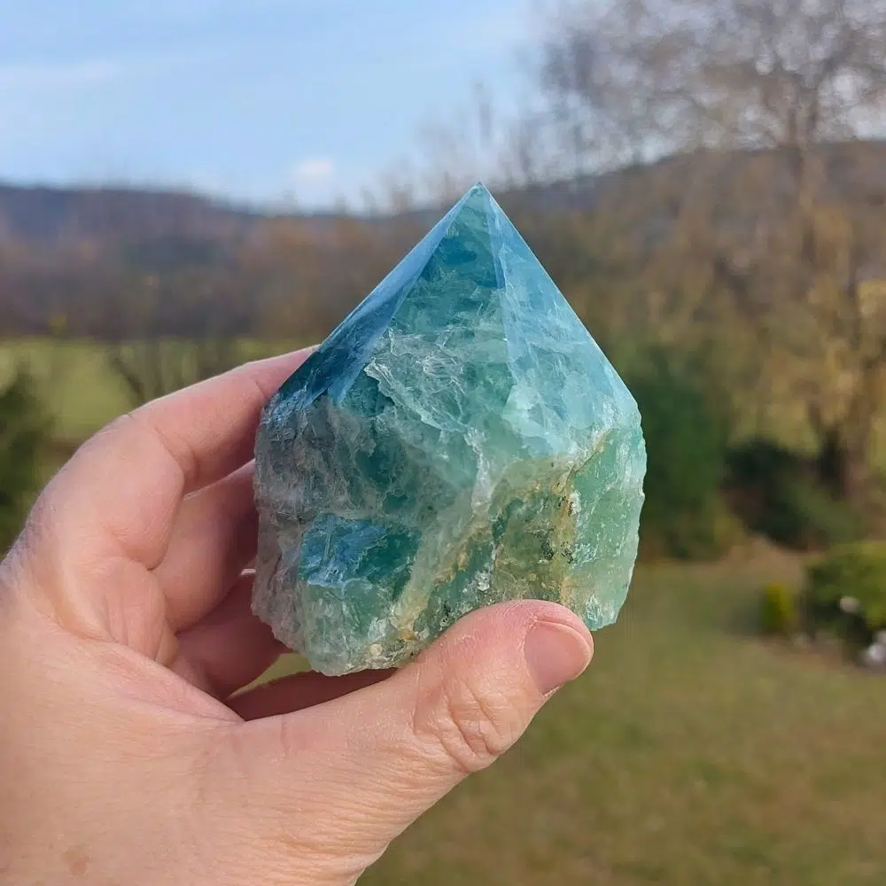 Kraftvolle grüne Fluorit Spitze – sie ist halbpoliert, dh. die Spitze ist geformt, der Rest ist natürlich Rohstein. Ideal zum Lernen oder für deinen Arbeitsplatz!