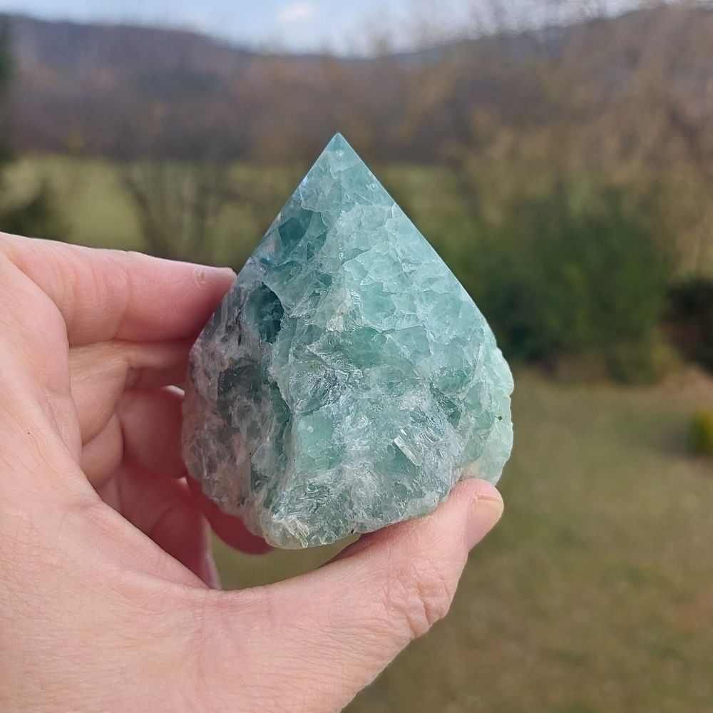 Kraftvolle grüne Fluorit Spitze – sie ist halbpoliert, dh. die Spitze ist geformt, der Rest ist natürlich Rohstein. Hilfreich zum Lernen oder deinen Arbeitsplatz!