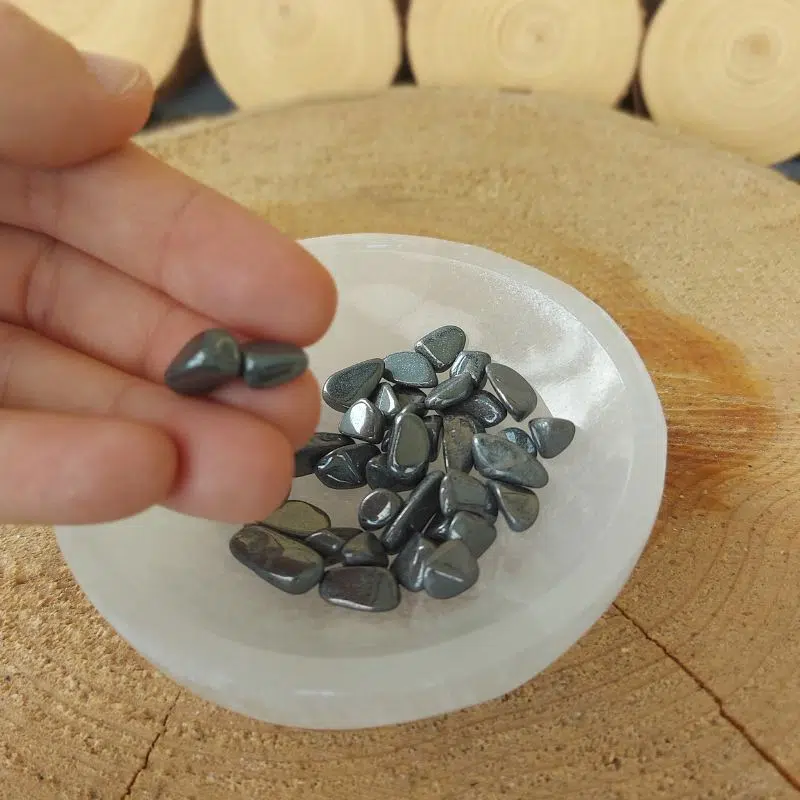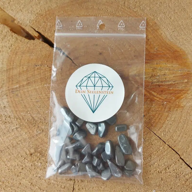 Hämatit in Form von Chips – das sind ganz kleine getrommelte Stücke von Hämatit. Diese Chips kannst du für Naturkosmetik verwenden oder auch in eine Schale zu anderen Heilsteinen legen.