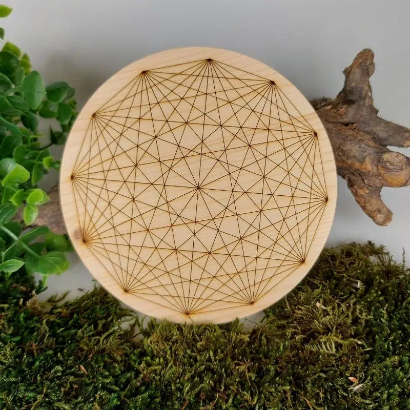 Mit dieser Holzscheibe kannst du ein Kristallgitter formen. Das Kristallgitter ist ein Werkzeug, das die Energie der Heilsteine mit der heiligen Geometrie verbindet. Ein Kristallgitter ist ein Muster, womit du deine Absicht verstärken kannst. Mit den Heilsteinen wird eine harmonische Beziehung zwischen den Energien, Formen und Farben der einzelnen Kristalle erschaffen.