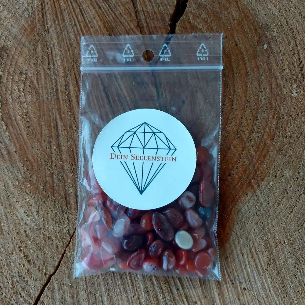 Karneol Chips sind ganz kleine getrommelte Stücke, die zum Beispiel perfekt für Naturkosmetik verwenden kannst. Sie passen sehr gut in die Roll-ons.