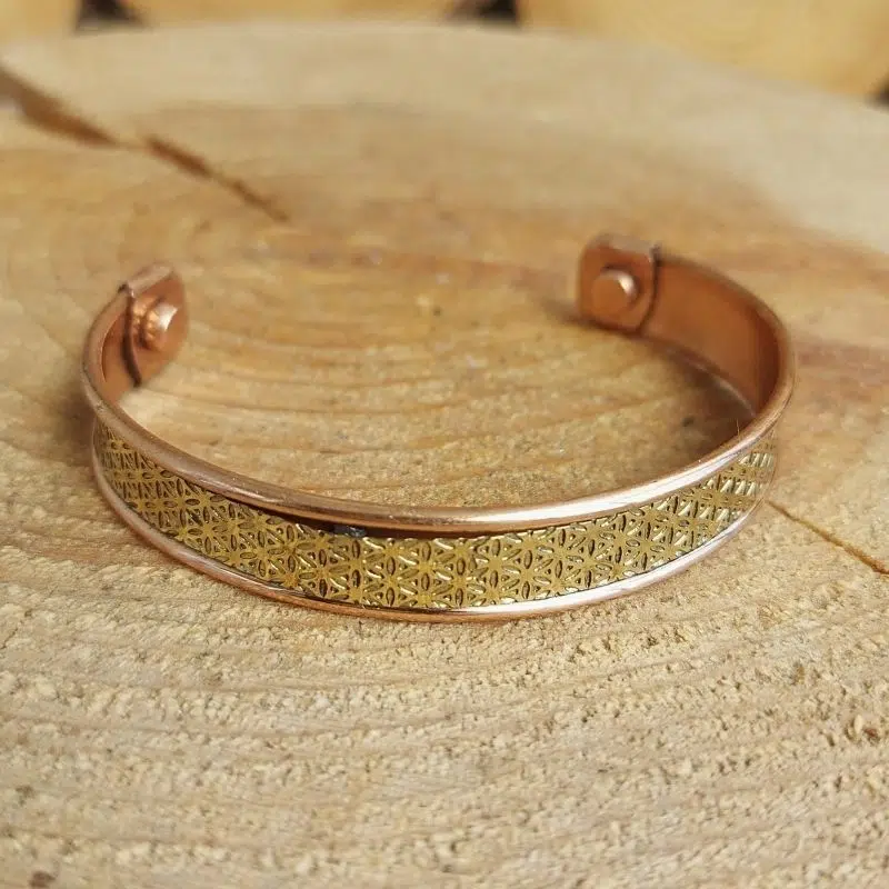 Kraftvolles Kupferarmband mit dem Motiv Blume des Lebens aus Indien für deine Erdung und einen starken Energiefluss – es hat auch zwei Magnete.