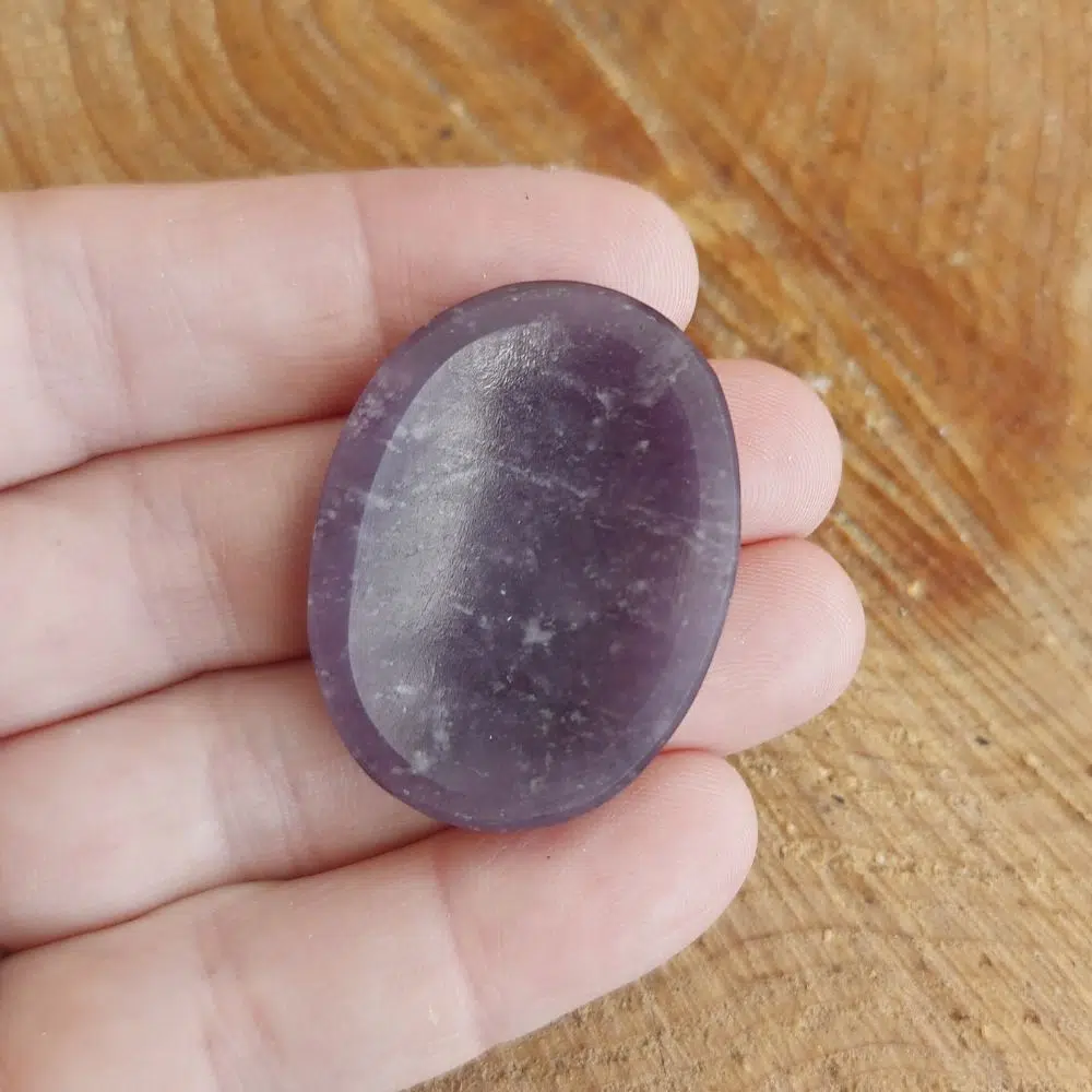 Der Lepidolith Daumenstein als Begleiter bei Veränderungern – immer in deiner Hosentasche mit dabei. Wenn du energetische Unterstützung brauchst, dann nimm den Heilstein in deine Handfläche und fahre mit dem Daumen über die geformte Seite – so überträgt sich seine kraftvolle Wirkung auf dich.