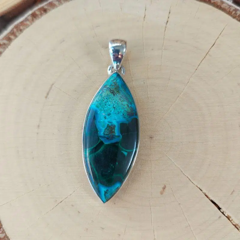 Dieser außergewöhnliche Malachit Chrysokoll Anhänger aus Kongo (Afrika) aus echtem Silber kombiniert die Wirkungen von Malachit und Chrysokoll. Er hilft dir, dich klare auszudrücken und bietet starken energetischen Schutz.