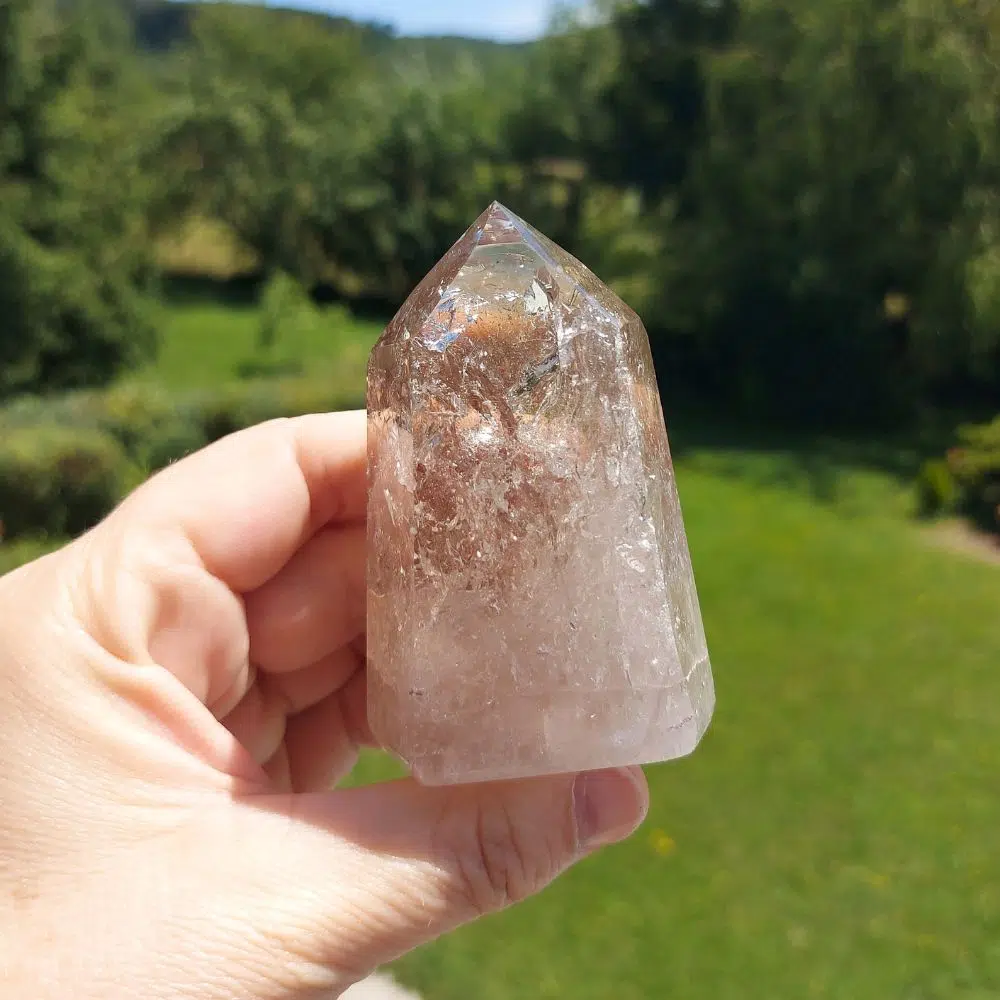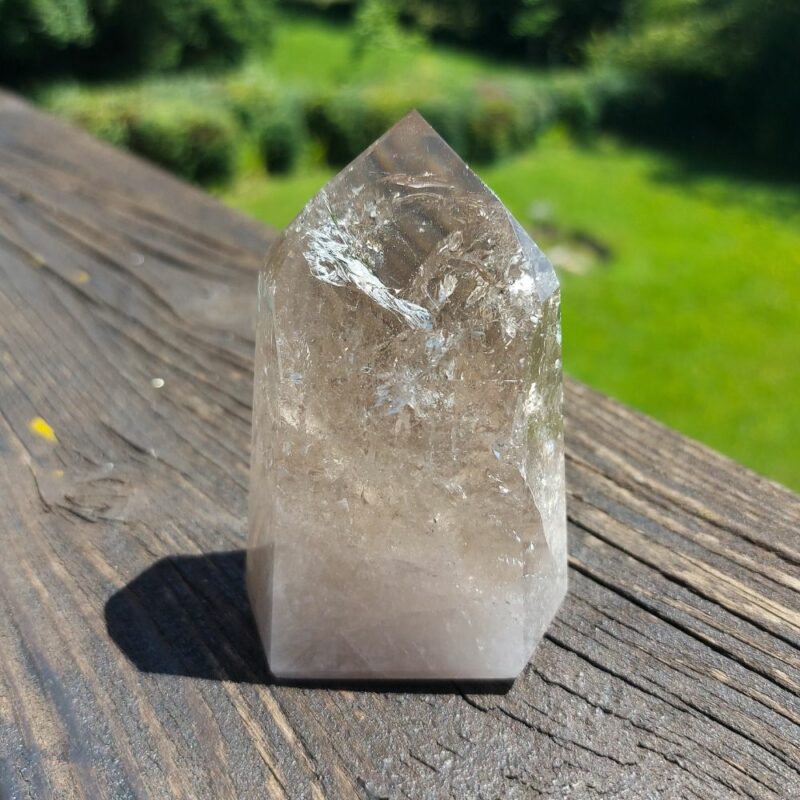 Diese einzigartige Rauchquarz Spitze mit Regenbogenprismen aus Brasilien unterstützt dich dabei Energieblockaden zu erkennen und zu beseitigen.
