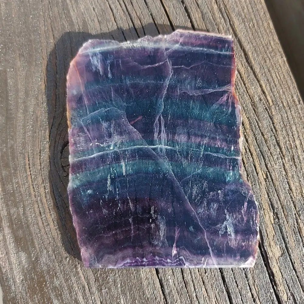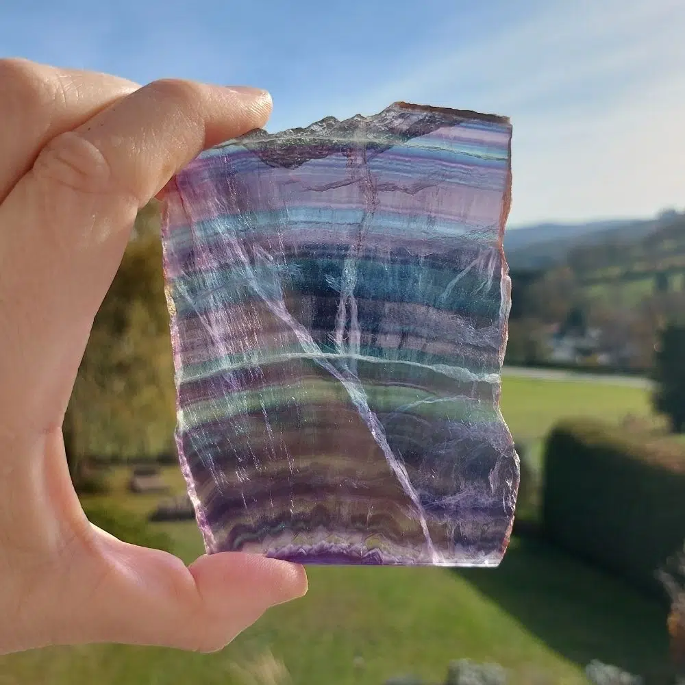 Einzigartiges Regenbogen Fluorit Stück. Wenn du diese Platte in die Sonne hältst, siehst du ihre faszinierenden Zeichnungen! Ideal für deinen Arbeitsplatz oder auch beim Lernen.