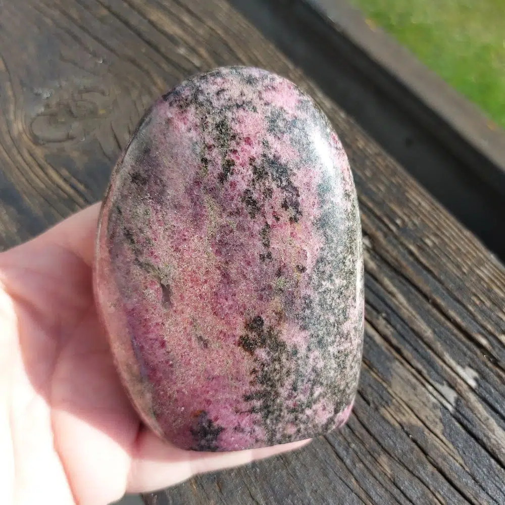 Diese kraftvolle Rhodonit kommt aus Madagaskar und hat eine schöne rosa-schwarze Farbe. Der Rhodonit hilft dir zu Vergeben und dich anzunehmen wie du bist. Dieser einzigartige Rhodonit unterstützt dich liebevoll auf deinem besonderen Weg.