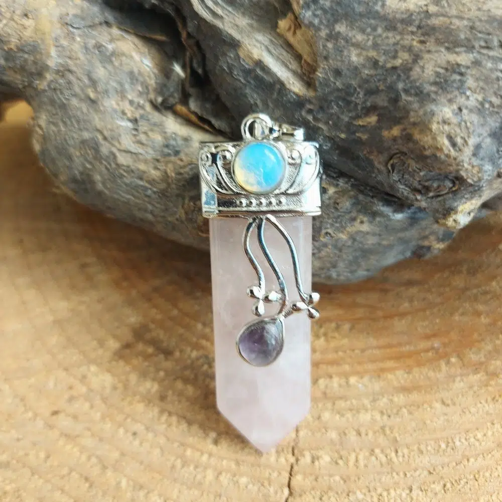 Dieser Rosenquarz Anhänger (versilbert) ist ein kraftvolles Stück! Er hat noch Verstärkung von einem kleinen Mondstein und einem kleinen Amethysten.