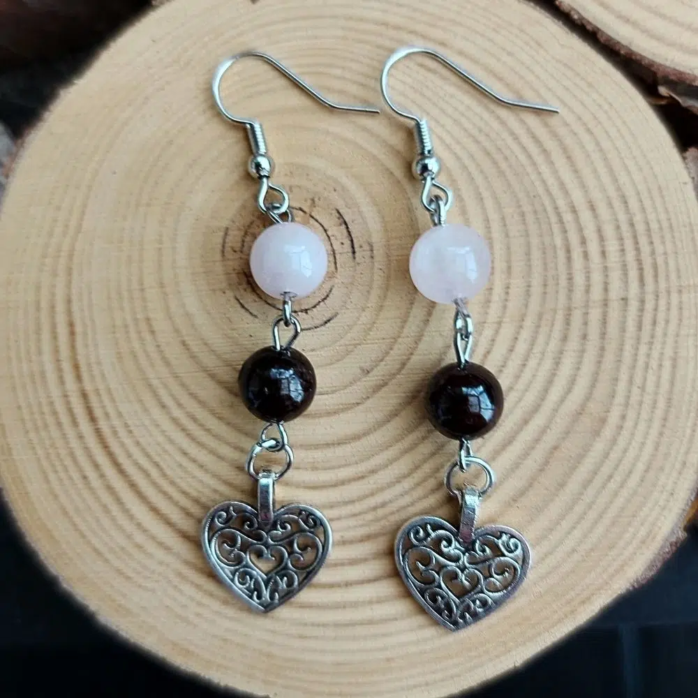 Zauberhafte Ohrringe mit Rosenquarz und Granat Perlen und einem kleinen Herz!