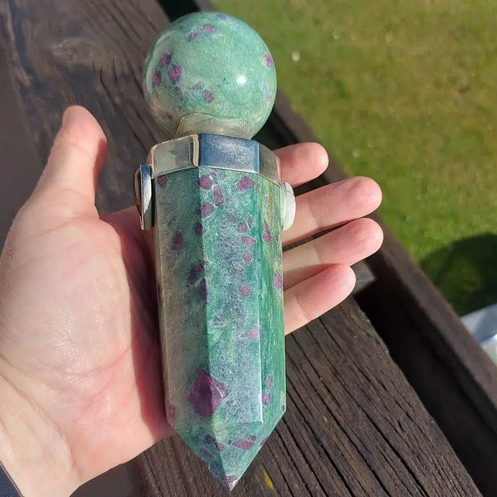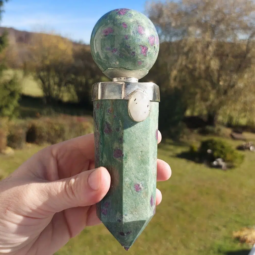 Einzigartiger Rubin Fuchsit Stab mit Kugel und kleinem Mondstein & Blutstein