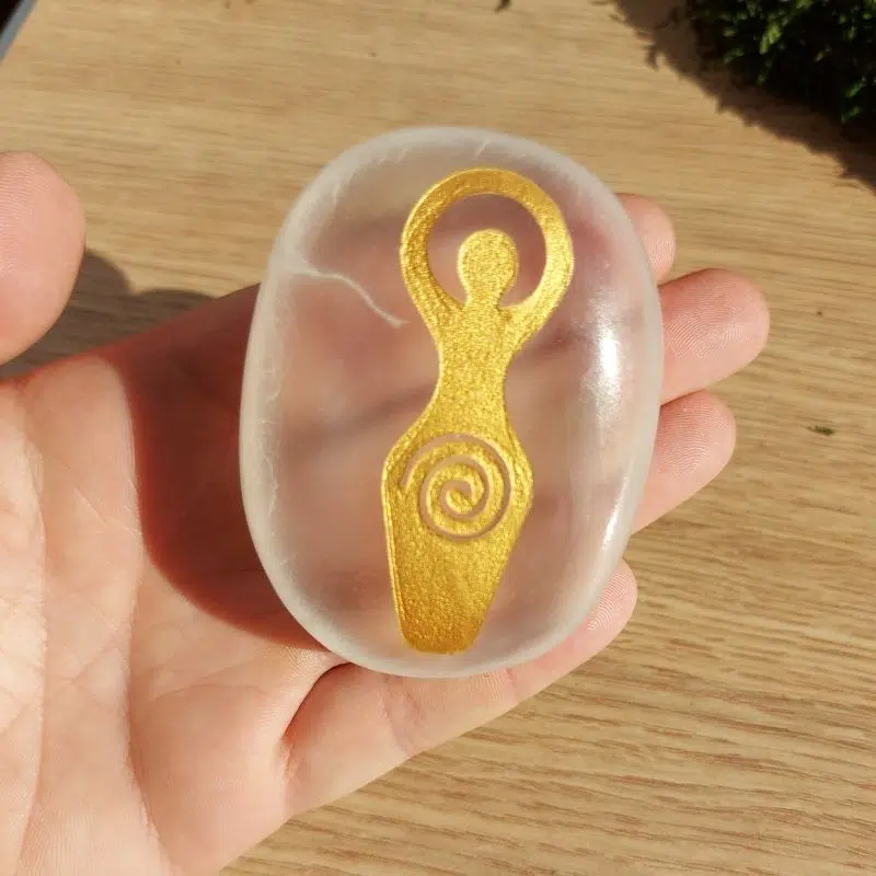 Handstein Selenit mit gravierter Erdgöttin Gaia.
