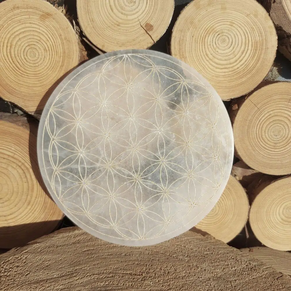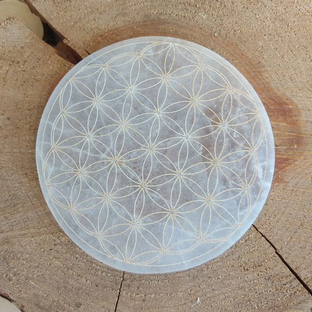 Lege oder stelle deine Heilsteine auf diese Platte und spüre die Kraft der geometrischen Form mit der Energie des Selenit.
