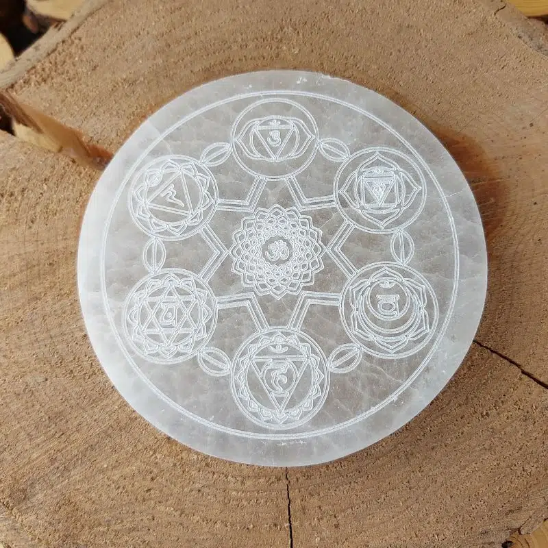 Runde, gravierte Selenit Platte mit dem MusterChakra“.