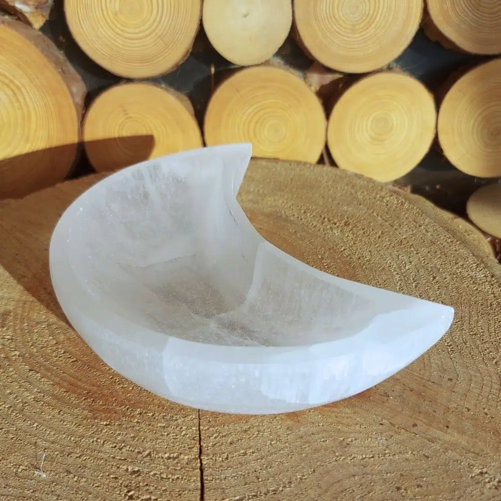 Diese mittelgroße Selenit Schale in der Form eines Mondes ist der ideale Weg, um Heilsteine gleichzeitig aufzubewahren, zu reinigen und aufzuladen.