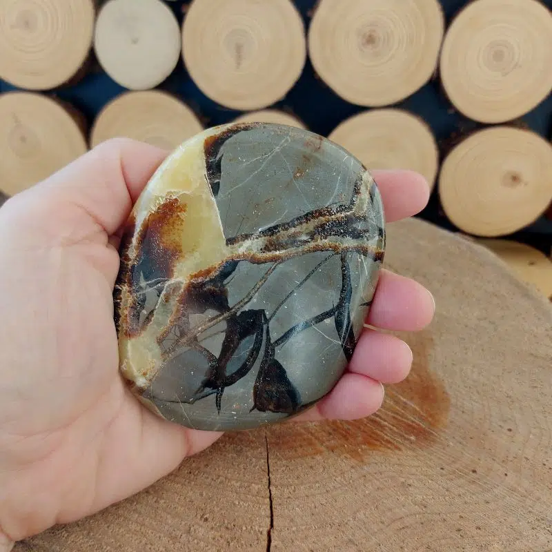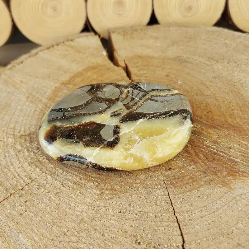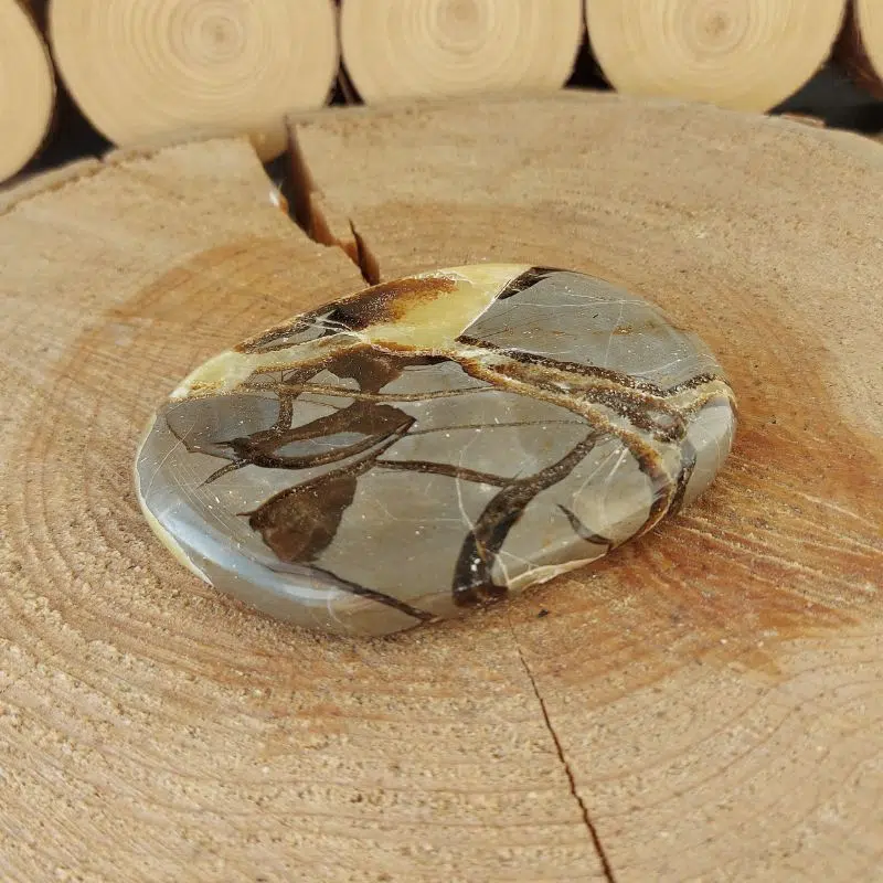 Einzigartige Septarie Scheibe aus Madagaskar. Septarie wird auch Drachenstein genannt und hilft dir, dich deinen Emotionen zu stellen.