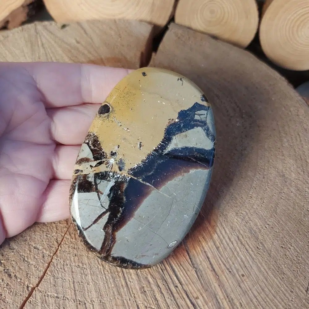 Besondere Septarie Scheibe aus Madagaskar. Septarie wird auch Drachenstein genannt und unterstützt dich dabei, dich deinen Emotionen und Konflikten zu stellen.