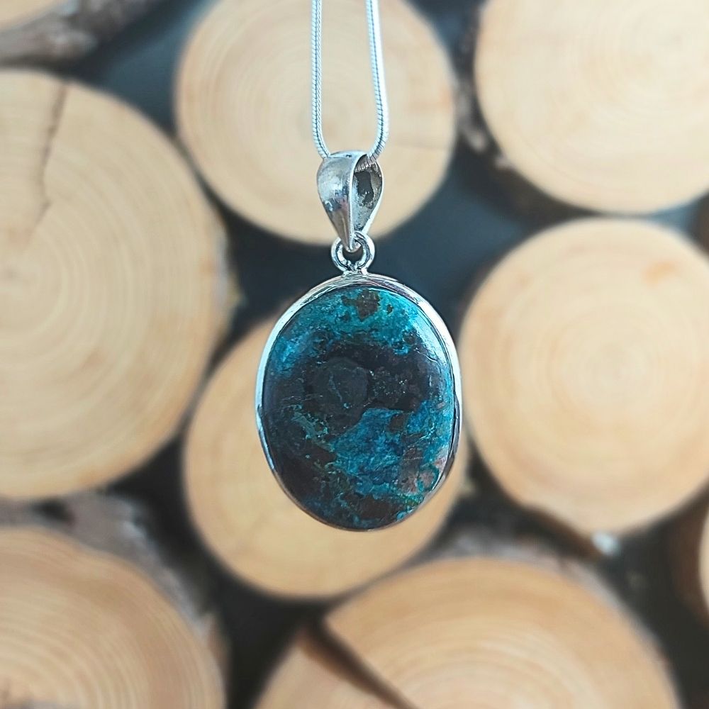 Kraftvoller ovaler Shattuckit Anhänger aus echtem Silber. Er hilft dir, deine Wahrheit auszusprechen!
