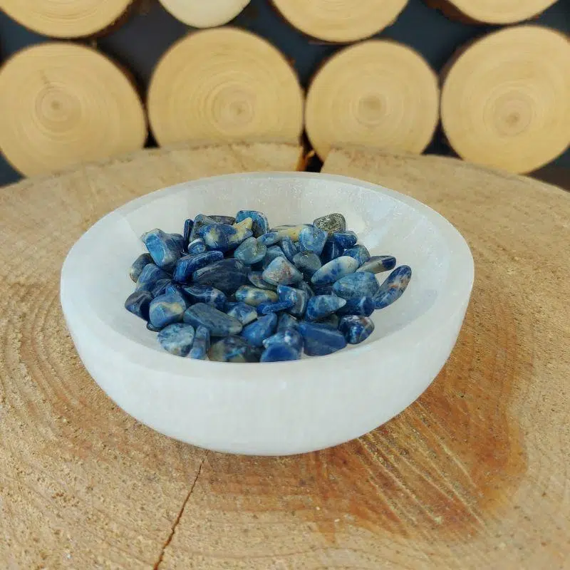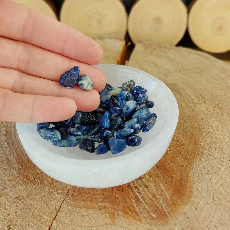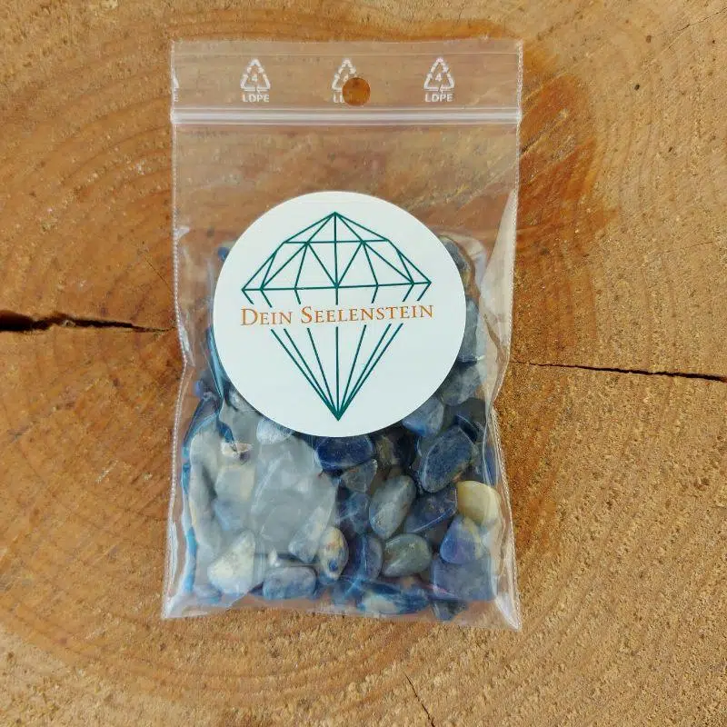 Sodalith in Form von Chips – das sind ganz kleine getrommelte Stücke von Sodalith. Diese Chips kannst du für Naturkosmetik verwenden oder auch in eine Schale zu anderen Heilsteinen legen.