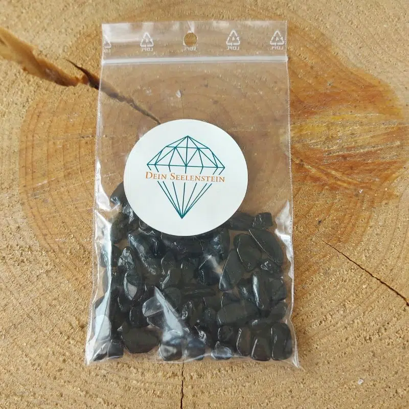 Turmalin in Form von Chips – das sind ganz kleine getrommelte Stücke von schwarzem Turmalin. Diese Chips kannst du für Naturkosmetik verwenden oder auch in eine Schale zu anderen Heilsteinen legen.