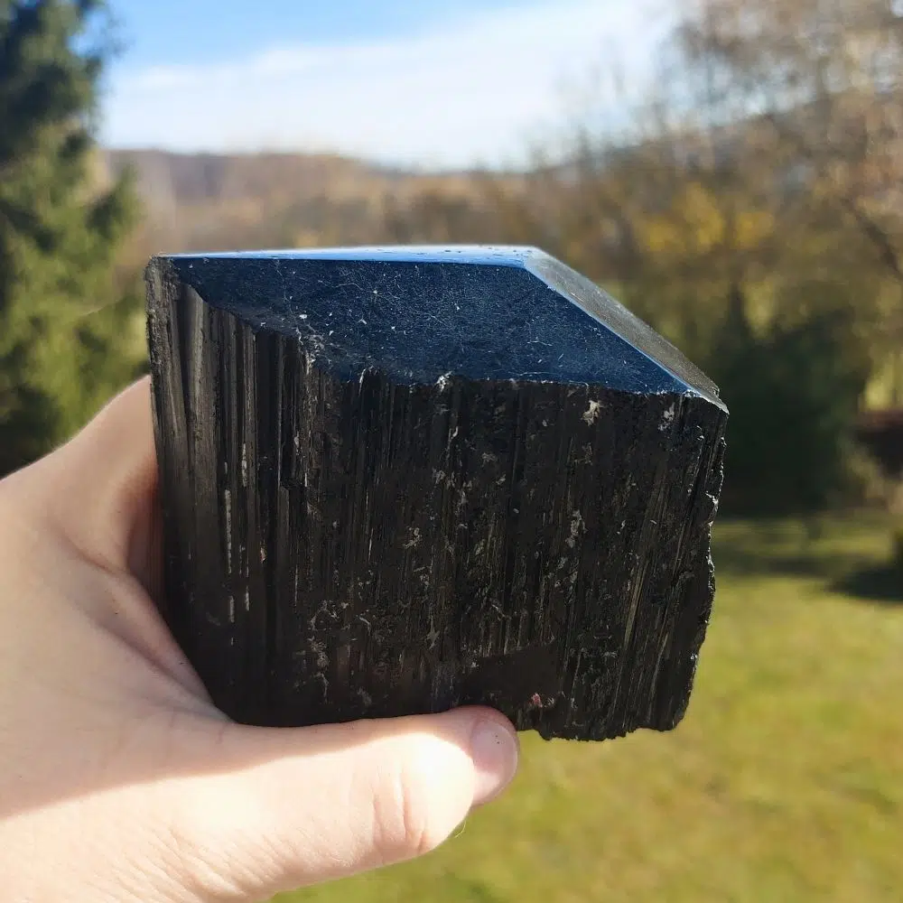 Der schwarze Turmalin Rohstein – einer der absolut wichtigsten Schutzsteine für dein Zuhause! Dieser Turmalin ist halbpoliert – die Spitze ist geschliffen, der Rest ist Rohstein! Ein kraftvoller Begleiter für dich!